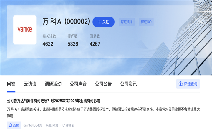 1月22日,据深交所互动易消息,针对投资者提出的“公司告万达的案件有何进展?对2025年或2026年业绩有何影响”的提问,万科企业股份有限公司回应,此案件目前是依法查封冻结了万达集团股权资产,但能否法拍变现存在不...