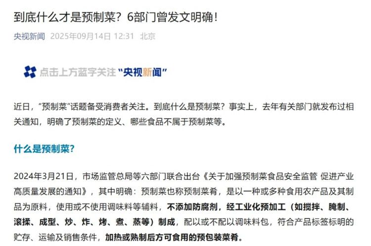9月14日,央视新闻就预制菜的定义做出明确介绍:预制菜也称预制菜肴,是以一种或多种食用农产品及其制品为原料,使用或不使用调味料等辅料,不添加防腐剂,经工业化预加工(如搅拌、腌制、滚揉、成型、炒、炸、烤、煮、蒸等)制成,配以或不配以调味料包,符合产品标签标明的贮存、运输及销售条件,加热或熟制后方可食用的预包装菜肴。《中华人民共和国消费者权益保护法》第八条规定,消费者享有知悉其购买、使用的商品或者接受的服务的真实情况的权利。