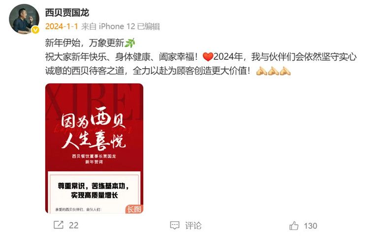 不过,对于罗永浩的频频喊话及@,“西贝贾国龙”的微博并无关于此次事件的相关动态,最后一次主动发博停留在2024年新年祝词。