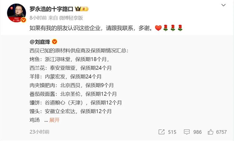 另外,对于网友晒出的“西贝已知的原材料供应商及保质期情况汇总”,罗永浩称,“如果有我的朋友认识这些企业,请跟我联系,多谢。”