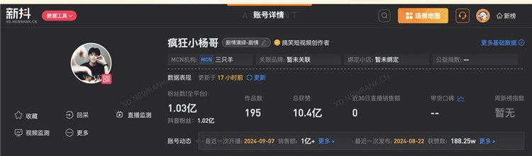 据新抖平台数据,曾与辛巴因大闸蟹等产品产生争议的“疯狂小杨哥”(张庆杨),自2024年9月7日后未再进行公开直播,其所属公司“三只羊”此前也因产品宣传问题接受监管部门调查并被处罚。