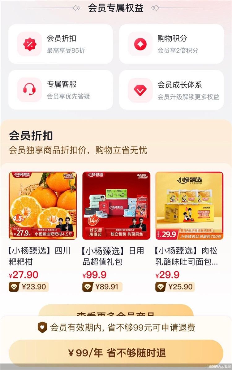 2025年4月,小杨臻选App在多个应用市场上线,会员99元/年,价格仅为东方甄选会员的一半。会员折扣为85折,开通界面显示,会员期内“省不够99元可退费”。