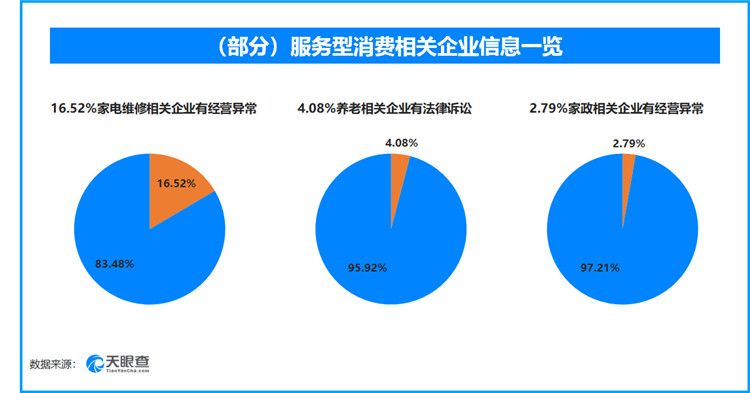 天眼查风险数据显示,从事家电维修相关企业中,16.52%曾出现经营异常,1.46%曾涉及法律诉讼;养老相关企业中,4.08%曾涉及法律诉讼,2.12%曾出现经营异常;家政相关企业中,2.79%曾出现经营异常,2.51%曾涉及法律诉讼。