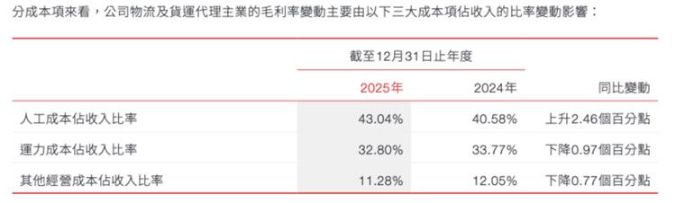 成本方面,占比最大的人工成本,去年占收入比率较2024年同期上升2.46个百分点至43.04%。财报指出,主要由于公司持续提升一线收派小哥的薪酬竞争力,并加大销售激励促进业务开发,业务量增长带动员工报酬增加。同时,公司通过智能化及无人化技术应用,提升操作效率,管控人工成本上涨幅度。