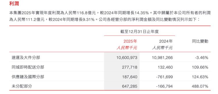 同城即时配送分部去年净利润约为2.8亿元,同比增长109.66%,净利润实现翻倍提升。供应链及国际分部去年净利润约为1.9亿元,实现扭亏为盈,同比增加9.5亿元。主要由于海外子公司KEX通过业务结构调优与精益经营降本,实现同比大幅减亏;若不考虑KEX因素,供应链及国际分部2025年净利润同比增超五成。