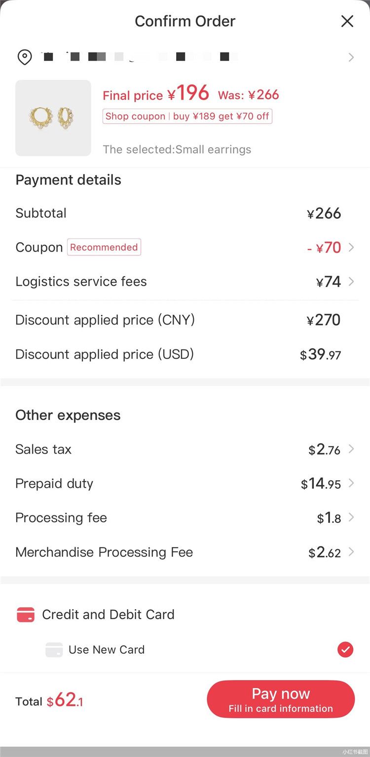 仅关税一项,就占了小红书部分跨境商品价格较高比重。以平台上一款ARSIS旗舰店的仿贝母珍珠耳饰为例,加上运费等各种费用,海外消费者购买时商品为62.1美元,而关税费用达到14.95美元,占比达到24%。