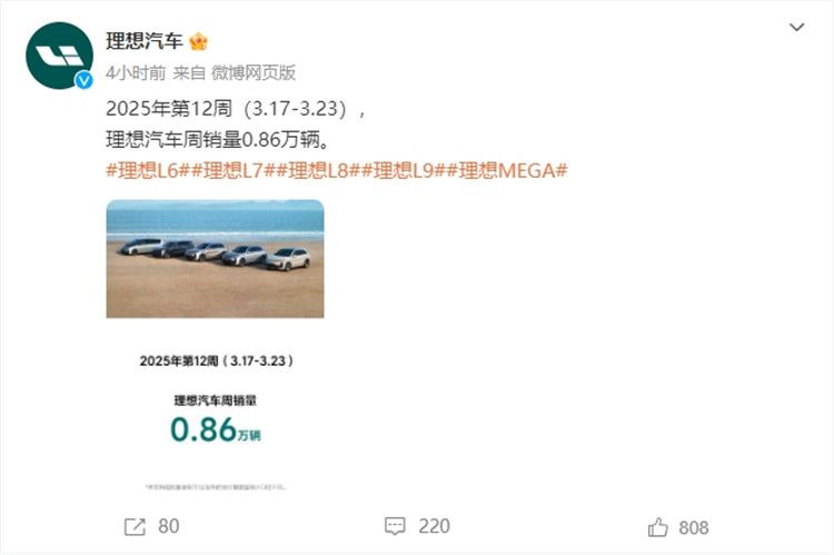 3月25日,理想汽车官方微博再次发布单周销量数据。与此前不同的是,此次仅公布了理想汽车的单周销量,未见其它品牌。数据显示,理想汽车3月17日至3月23日的单周销量为0.86万辆。