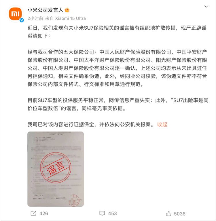 针对网络流传的小米车型拒保相关传言,小米称:经与我司合作的五大保险公司:中国人民财产保险股份有限公司、中国平安财产保险股份有限公司、中国太平洋财产保险股份有限公司、阳光财产保险股份有限公司、中国人寿财产保险股份有限公司逐一确认,上述公司均表示从未出具过任何拒保通知,相关文件确系伪造。此外,经同业公司校验,该伪造文件亦不符合保险公司内部文件格式、行文标准和用章通行规范。