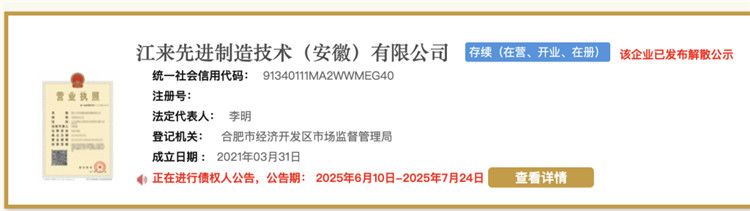 7月7日,据国家企业信用信息公示系统官方网站,江来先进制造技术(安徽)有限公司新增1条注销备案公告,注销原因为“决议解散”,该公司于2021年03月31日正式成立。