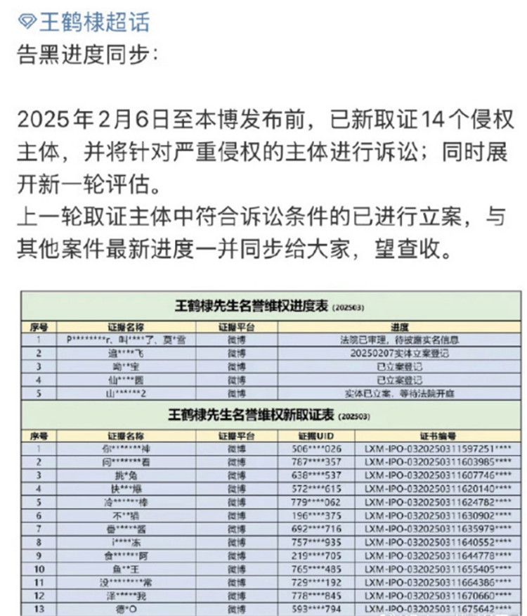 近日,王鹤棣方公开了“告黑案”进度,称从2025年2月6日至目前,已新取证14个侵权主体,并将针对严重侵权的主体进行诉讼;同时展开新一轮评估。 上一轮取证主体中符合诉讼条件的已进行立案,与其他案件最新进度一并同步给大家。
