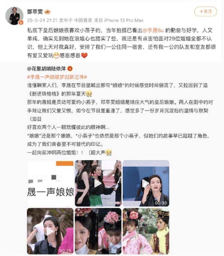 3月24日,邓萃雯发文大赞李晟,称其勤奋好学,在录制《浪姐》时看到她后,自己心里也踏实了很多。另外邓萃雯还称,当年在拍摄《新还珠格格》时,自己虽然饰演的是皇后,与“小燕子”有不少矛盾,但是戏外的皇后还是非常喜欢“小燕子”。
