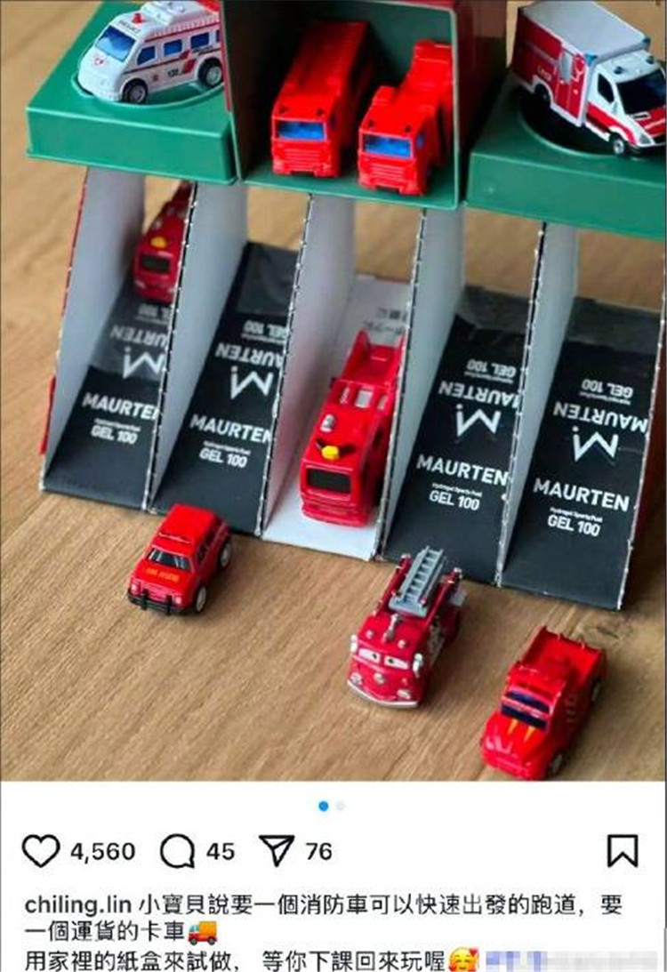 近日,林志玲晒出自己为为儿子做出手工卡车,并配文:“小宝贝说要一个消防车可以快速出发的跑道,要一个运货的卡车,用家里的纸盒来试做,等你下课回来玩喔”只见图中的纸盒精致,林志玲的手非常巧。
