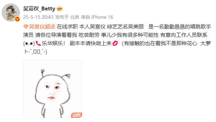 5月15日,演员、歌手吴宣仪在自己的社交平台上在线求职,她表示自己是一名勤勤恳恳的唱跳歌手演员,请各位导演看看自己,自己吃苦耐劳并且事儿少有多种可能性。并直言“剧本本请快吻上来” 。
