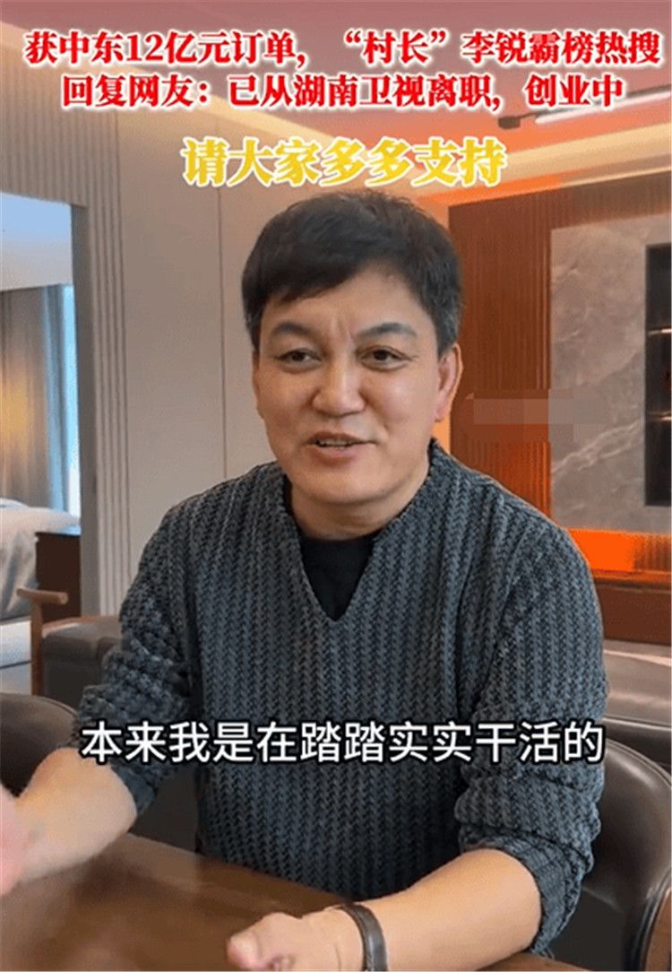 10月16日,“村长”李锐接受采访,他表示“这两天本来是在踏踏实实干活,不知道怎么就频频上热搜了,有些事情这次就跟大家聊一聊,第一件事就是我已经离开了心爱的湖南卫视,自己出来创业,请大家以后多多支持,第二就是在中东拿到12亿的订单,这是我们集体努力的结果,我只是其中的普通一员。”