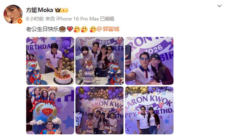 26日,方媛在社交平台分享郭富城生日派对照片,并配文“老公生日快乐”。随后郭富城回复“谢谢老婆,谢谢大家的祝福”。据悉,这是方媛生完三胎后首度露面,照片中,方媛状态极佳,和郭富城甜蜜比心,幸福满溢。