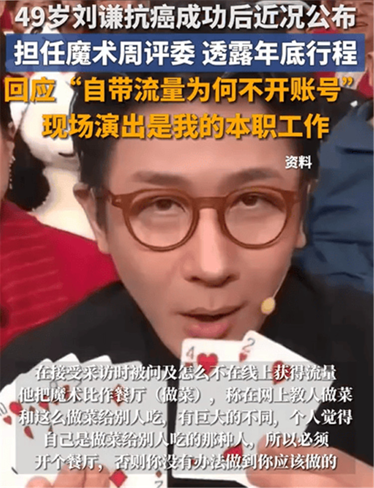 近日,49岁刘谦抗癌成功后近况公布,他担任了上海国际魔术周评委,在接受采访时被问及怎么不在线上获得流量。他把魔术比作餐厅(做菜),称在网上教人做菜和这么做菜给别人吃,有巨大的不同,个人觉得自己是做菜给别人吃的那种人,所以必须开个餐厅,否则你没有办法做到你应该做的。