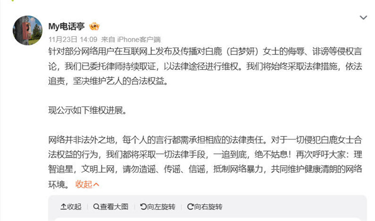 11月23日,白鹿方更新了维权进展:针对部分网络用户在互联网上发布及传播对白鹿的侮辱、诽谤等侵权言论,已委托律师持续取证,以法律途途径对公示的63个涉案账号展开追责。