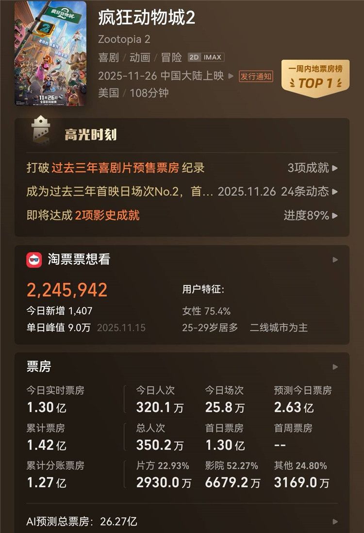 迪士尼动画电影《疯狂动物城2》午夜场票房1300万元,大幅提升了《小黄人大眼萌》保持的454万好莱坞动画午夜场纪录。