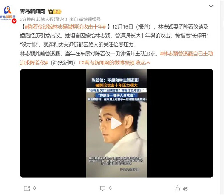 12月16日,林志颖妻子陈若仪谈及婚后经历引发热议。她坦言因嫁给林志颖,曾遭遇长达十年舆论攻击,被指责“长得丑”“没才能”,就连和丈夫逛街都因路人的关注倍感压力。林志颖此前曾透露,当年在车展对陈若仪一见钟情并主动追求。