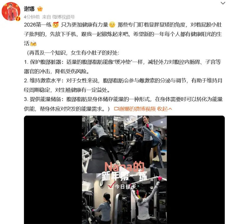 近日,谢娜在跨年晚会上被网友审判身材不好,她晒出健身视频回应:“那些专门盯着显胖显矮的角度,对着屁股小肚子批判的,先放下手机,跟我一起锻炼起来吧,希望新的一年每个人都有健康阳光的生活。”