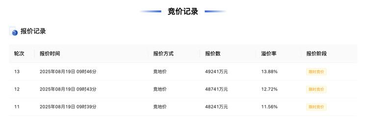 竞价记录显示,上述地块经过13轮竞价后,由杭州蓝滨房地产开发有限责任公司以总价49241万元竞得,成交楼面价18220元/平方米,溢价率13.88%。