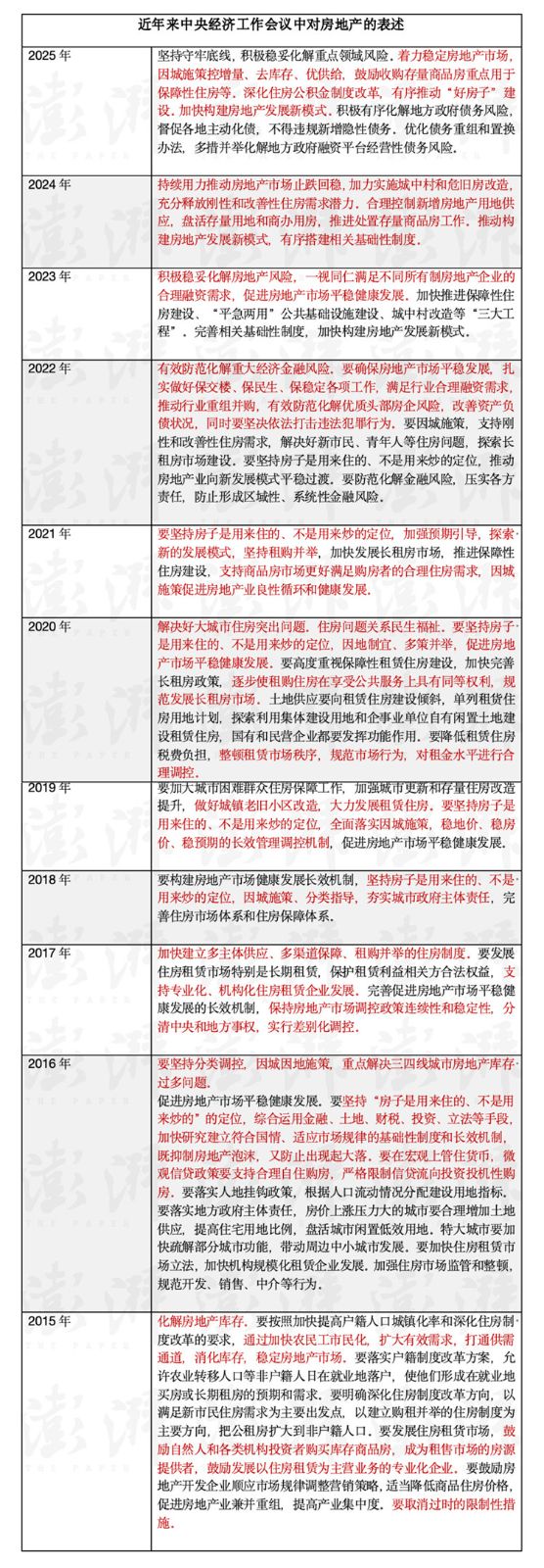 对于明年房地产市场的定调,会议提出“着力稳定房地产市场”。这是继2024年中央经济工作会议提出“持续用力推动房地产市场止跌回稳”后,中央经济工作会议再次强调“稳楼市”。