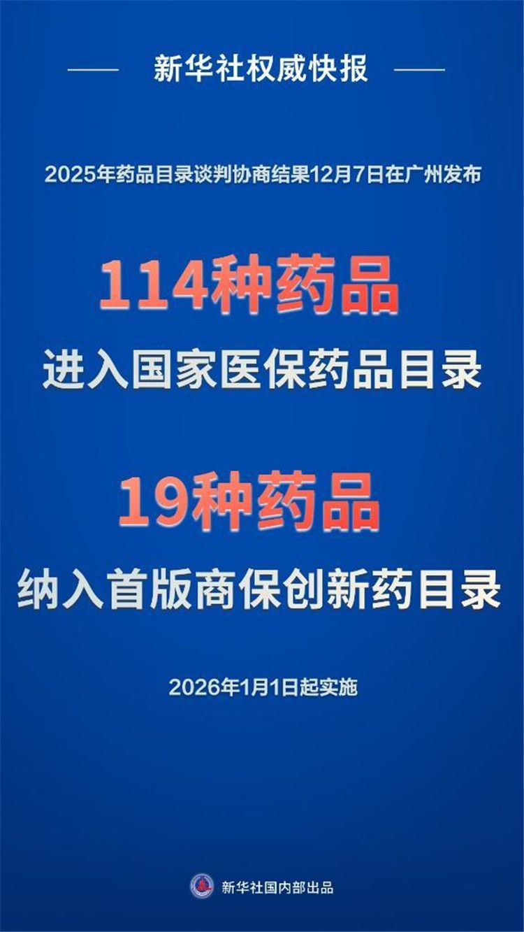 12月7日,在2025创新药高质量发展大会上,新版国家医保药品目录及首版商保创新药目录正式发布,114种药品成功纳入医保、19种新药进商保创新药目录,对参保人“药篮子”全面升级。