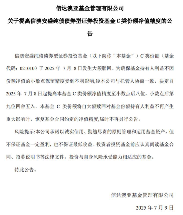 7月9日,信澳安盛利纯债基金发布调整份额净值精度的公告。该基金C类份额于7月8日发生大额赎回,为确保基金持有人利益不因净值的小数点保留精度受到不利影响,公司决定自当日起提高该基金C类份额净值精度至小数点后八位,小数点后第九位四舍五入。同日,汇安裕泰纯债基金C份额也发布类似公告。