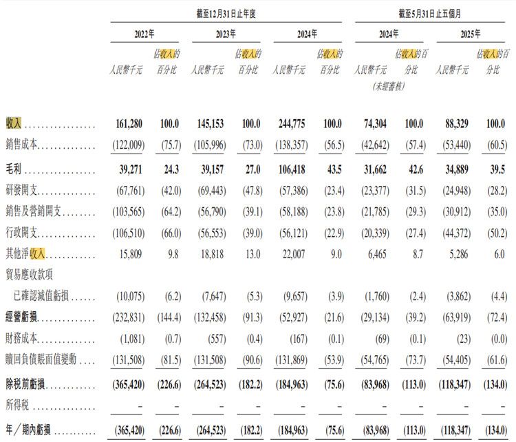 招股书显示,2022年至2024年及2025年前5月,云迹科技实现营业收入1.61亿元、1.45亿元、2.45亿元和0.88亿元;期内亏损分别为3.65亿元、2.65亿元、1.85亿元和1.18亿元。