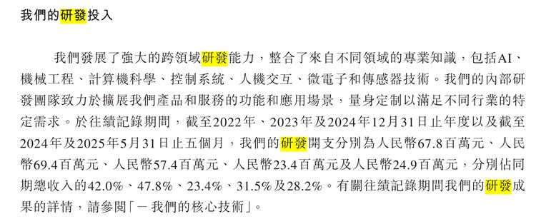 2022年至2024年及2025年前5月,云迹科技的研发开支分别约为6780万元、6940万元、5740万元及2490万元,分别占同期总收入的42.0%、47.8%、23.4%及28.2%。