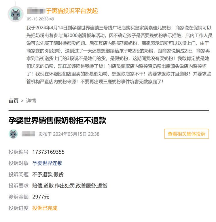 一个消费者投诉孕婴世界的奶粉是假奶粉,以下是该消费者的描述:“我于2024年4月14日到孕婴世界连锁三号线广场店购买皇家美素佳儿奶粉,商家说在促销可以先把奶粉囤着参与满3000送滑板车活动。因不确定孩子是否要换奶粉表示拒绝,店内工作人员说可以先买了随时换都没问题。后在其店内购买7罐奶粉,商家表示奶粉可以送货上门,由于商家送的3段奶粉,送到过了一天还是想继续给孩子吃2段的奶粉,跟商家说换成2段,商家再拿到当初送货上门的3段说不是她们的货,是假奶粉,这期间我没有买奶粉!我敢肯定就是她们送来的奶粉,现在却诬陷是我换了货!叫店员调取店内监控查奶粉出库源头说店内监控坏了!我现在怀疑她们店里卖的都是假奶粉,想退款店家不干!我要求退款并且道歉!并要求监管机构严查店内奶粉来源!不要再出现三鹿奶粉事件坑害无数家庭了!”