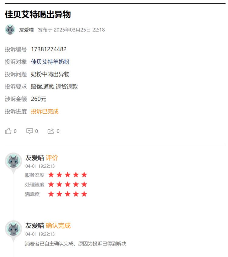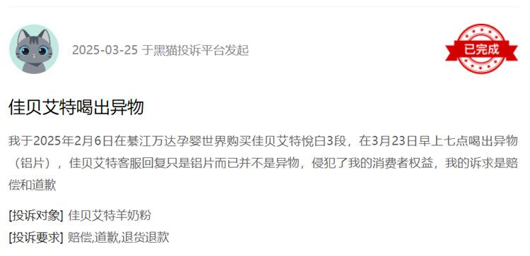 另一消费者也投诉孕婴世界的奶粉是假奶粉,以下是该消费者的描述“我于2025年2月6日在綦江万达孕婴世界购买佳贝艾特悦白3段,在3月23日早上七点喝出异物(铝片),佳贝艾特客服回复只是铝片而已并不是异物,侵犯了我的消费者权益,我的诉求是赔偿和道歉。”