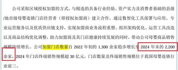 从经营模式来看,孕婴世界主要以商业特许经营模式开展业务,截至2024年末,孕婴世界加盟门店数量有2200余家。