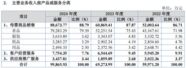报告期内,孕婴世界来自母婴商品销售的收入占比分别为86.71%、87.87%和88.79%,其中来自食品的收入占比分别为71.98%、75.43%和79.39%,其余分别来自母婴用品方面的服装、 纸品和用品;此外,该公司来自客户经营服务的收入占比分别为9.91%、9.45%和7.76%,来自供应商推广服务的收入占比分别为3.37%、2.68%和3.44%。