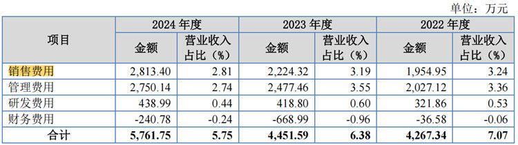 由此可见,孕婴世界计划75%的募集资金用于销售服务网络建设项目。从2022年至2024年(以下简称报告期),该公司的销售费用分别为1954.95万元、2224.32万元和2813.4万元,占当期营业收入的比例分别为3.24%、3.19%和2.81%,远超该公司的研发费用。