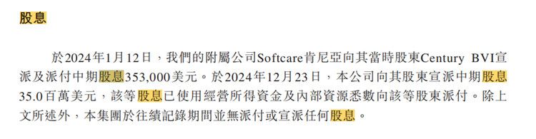 招股书显示,2024年,乐舒适进行了两笔派息。2024年1月,乐舒适附属公司Softcare肯尼亚向Century BVI派付中期股息35.3万美元;同年12月,乐舒适又向股东宣派3500万美元中期股息。