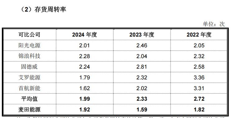 报告期内,麦田能源的存货周转率分别为1.82次/年、1.59次/年和1.92次/年,同期可比公司的存货周转率均值分别为2.72次/年、2.33次/年和1.99次/年。可见,该公司的存货周转率低于同行可比均值。