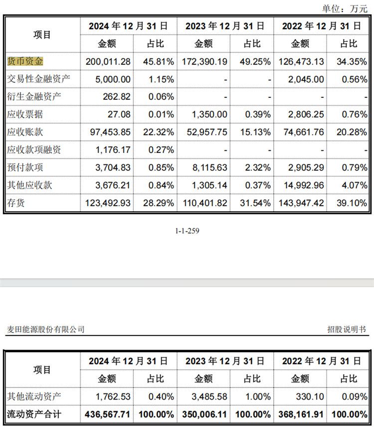 在阅读该公司提供的上市资料时,《笔尖网》注意到,报告期内,麦田能源的产能利用率出现下滑,库存商品占比高,10亿元募资的产能如何消化?此外,该公司的核心产品的单价下降致其毛利率低于同行可比公司毛利率,且其研发费用率低于销售费用率。截至2024年12月31日,麦田能源货币资金余额约20亿元,还在报告期内现金分红3169万元,此次IPO公司拟用3亿元募资补充流动资金。