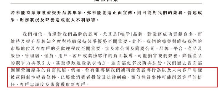 《笔尖网》关注到2020年,嗨学网因退费难问题被央视“3.15晚会”点名曝光。嗨学网在招股书中指出,公司过去曾面临因运营而产生的负面报道。例如,曾有报导称公司据称销售误导行为以及未向客户明确披露限制性退费条件,已导致消费者投诉及法律纠纷。类似性质事件可能削弱客户的信任、客户忠诚度及影响获取新客户。