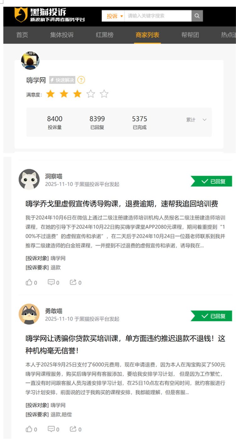 经黑猫投诉检索,关于嗨学网的投诉量高达8400条。其中关于“诱导购课”、“推迟退款”等问题仍屡见不鲜。
