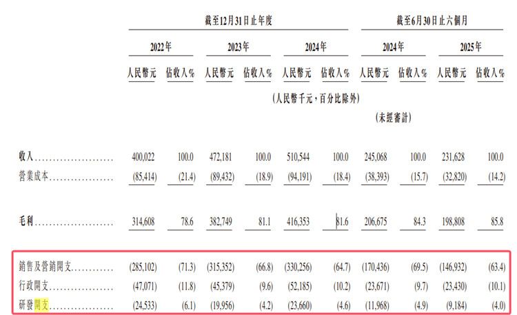 招股书显示,2022年至2024年及2025年上半年,嗨学网产生销售及营销开支,分别为2.85亿元、3.15亿元、3.30亿元及1.47亿元,分别占同期收入的71.3%、66.8%、64.7%及63.4%。