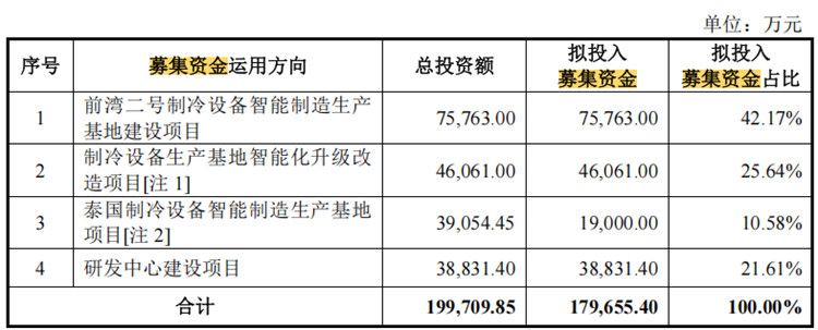此次IPO,惠康科技计划募集资金17.97亿元,其中,7.58亿元用于前湾二号制冷设备智能制造生产基地建设项目,4.61亿元制冷设备生产基地智能化升级改造项目,1.9亿元用于泰国制冷设备智能制造生产基地项目,3.88亿元用于研发中心建设项目。