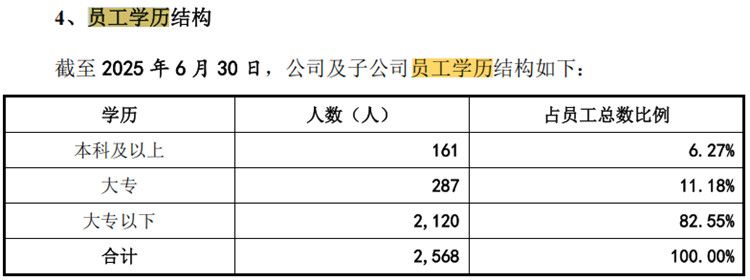 同期,该公司的本科以上学历员工数量为161人,占当期员工总数的比例为6.27%。