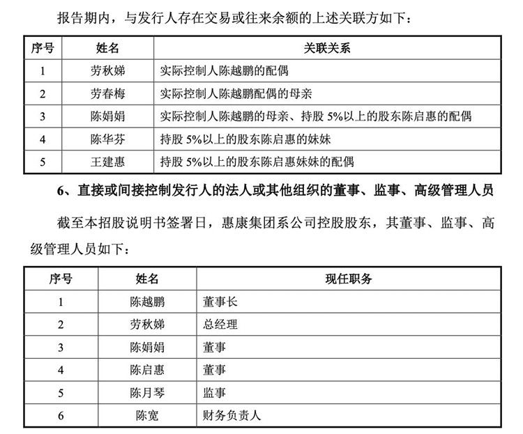 惠康科技的关联关系“复杂”,且实控人的多为亲戚在公司中担任要职。惠康集团是发行人的控股股东,陈越鹏任董事长,劳秋娣任总经理,陈娟娟、陈启惠任董事,陈月琴任监事。