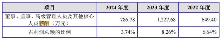 从2022年至2024年(以下简称报告期),江松科技的董事、监事、高级管理人员及其它核心人员薪酬分别为649.4万元、1227.68万元和786.78万元,占利润总额的比例分别为6.64%、8.26%和3.74%。