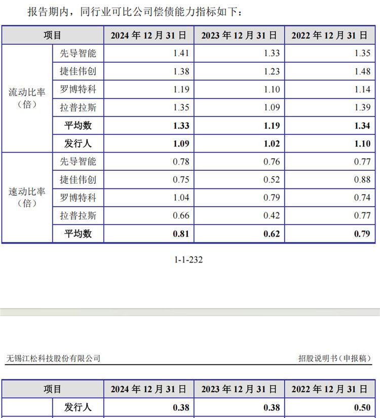 报告期内,江松科技的流动比率分别为1.10倍、1.02倍和1.09倍,速动比率分别为0.50倍、0.38倍和0.38倍。通常来说,流动比率大于2倍,速动比率大约1倍,这是较好的流动性比率标准。由此可见,江松科技的流动比率和速动比率都低于上述标准。而且,江松科技的短期流动性指标也低于行业指标。报告期内,流动比率行业均值分别为1.34倍、1.19倍和1.33倍,速动比率行业均值0.79倍、0.62倍和0.81倍。