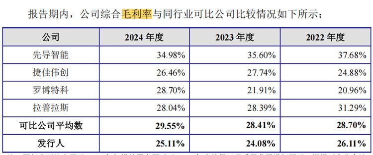 报告期内,江松科技的毛利率分别为26.11%、24.08%和25.11%,同期,该公司的同行可比公司的毛利率均值分别为28.7%、28.41%和29.55%。由此可见,报告期内,江松科技的毛利率低于同行均值2-4个百分点。
