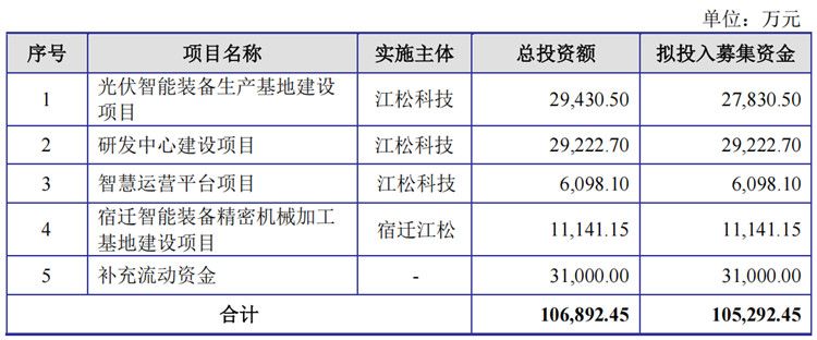 此次IPO,江松科技计划募集资金10.53亿元,其中,2.78亿元用于光伏智能装备生产基地建设项目,2.92亿元用于研发中心建设项目,0.61亿元用于智慧运营平台项目,1.11亿元用于宿迁智能装备精密机械加工基地建设项目,3.1亿元用于补充流动资金。