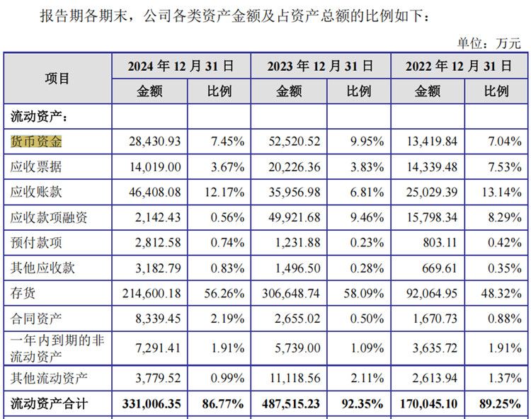 事实上,江松科技的货币资金并不富裕。报告期内,该公司拥有的货币资金分别为1.34亿元、0.53亿元和2.84亿元,占当期流动资产的比例分别为7.04%、9.95%和7.45%。