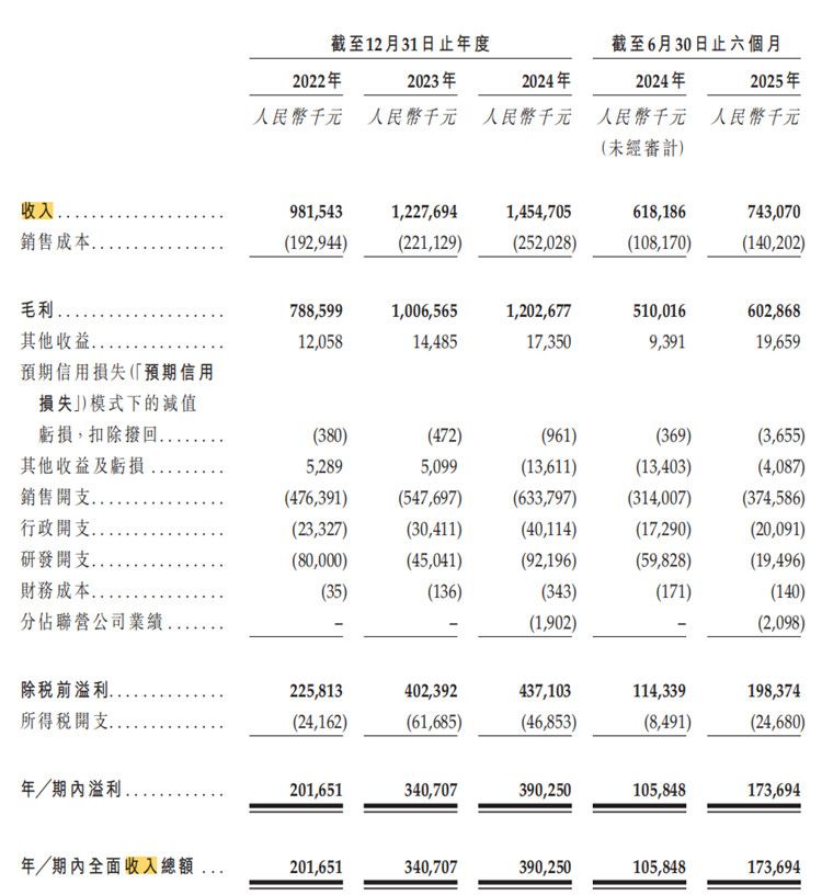 招股书显示,2022-2024年,蔓迪国际实现营业收入分别为9.8亿元、12.3亿元及14.5亿元,营收持续增长;同期期内溢利分别为2022-2024年分别为2.0亿元、3.4亿元及3.9亿元。另一方面,2025年上半年,公司营收为7.4亿元,同比增长20.2%,期内溢利为1.7亿元。